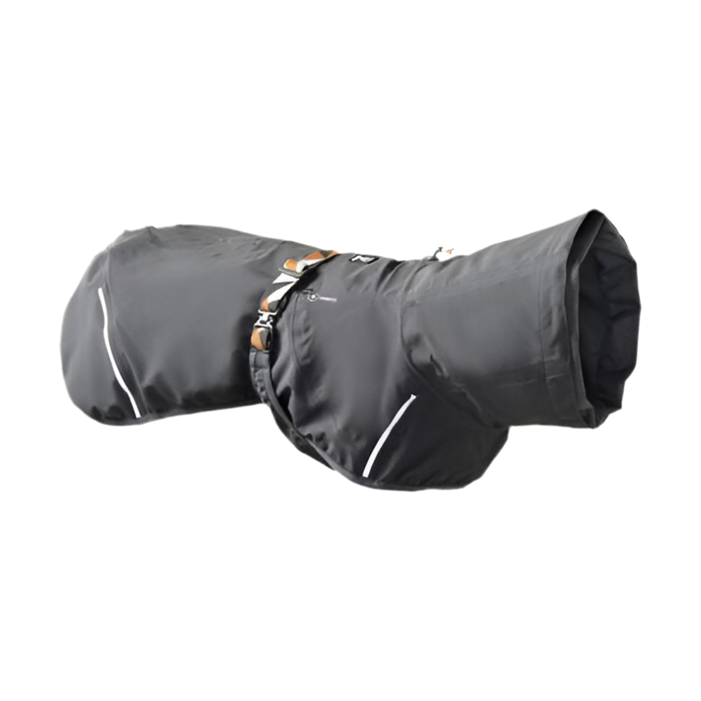 Denne tynde hunderegnfrakke har ikke stoffoer, men er lamineret med en blød, glat vandtæt membran. Regngennemtrængeligheden er gennemtænkt ned til mindste detalje. Åbningen til fastgørelse af hundesnoren kan klikkes til, så vandet ikke løber ned ad ryggen på hunden. Den vandtætte regnstops-krave kan strammes bag ørerne, så vandet ikke løber ned ad hundens hals. Desuden er hunderegndækkenet vandtæt med fuldt tapede sømme.